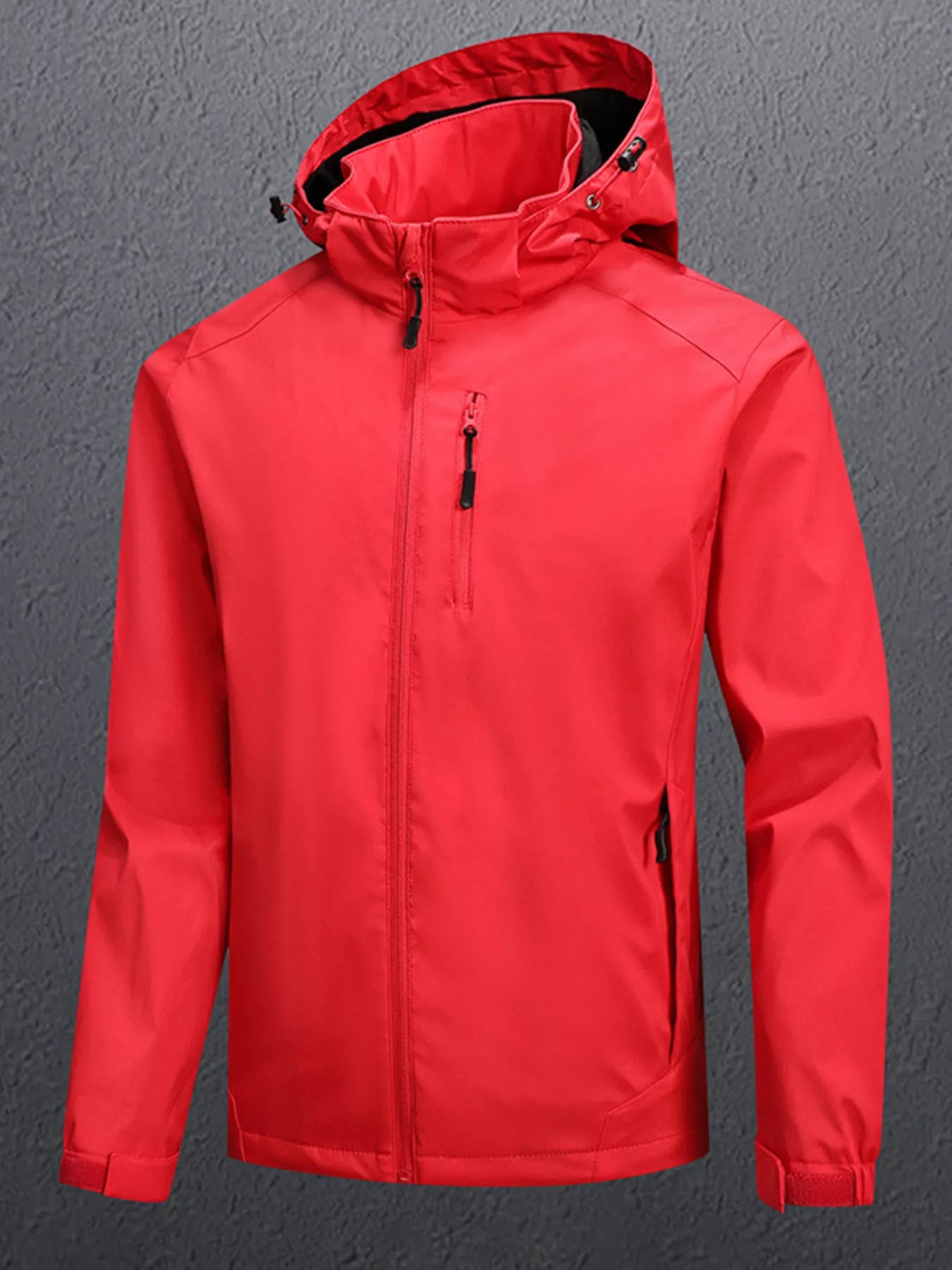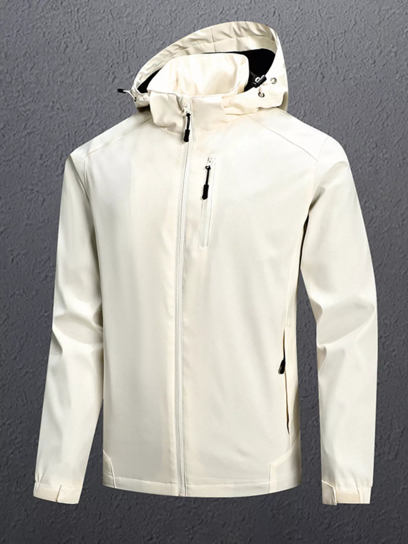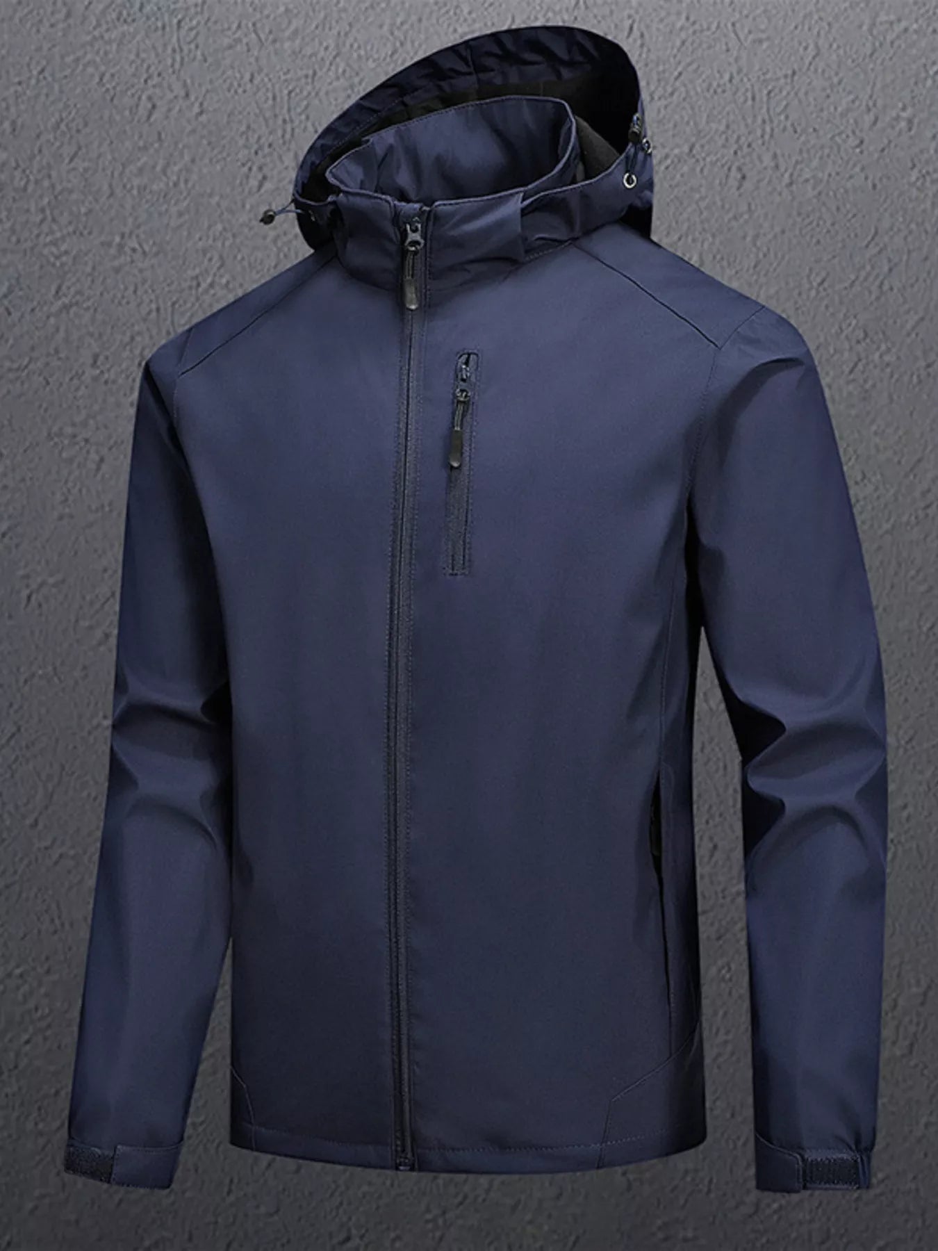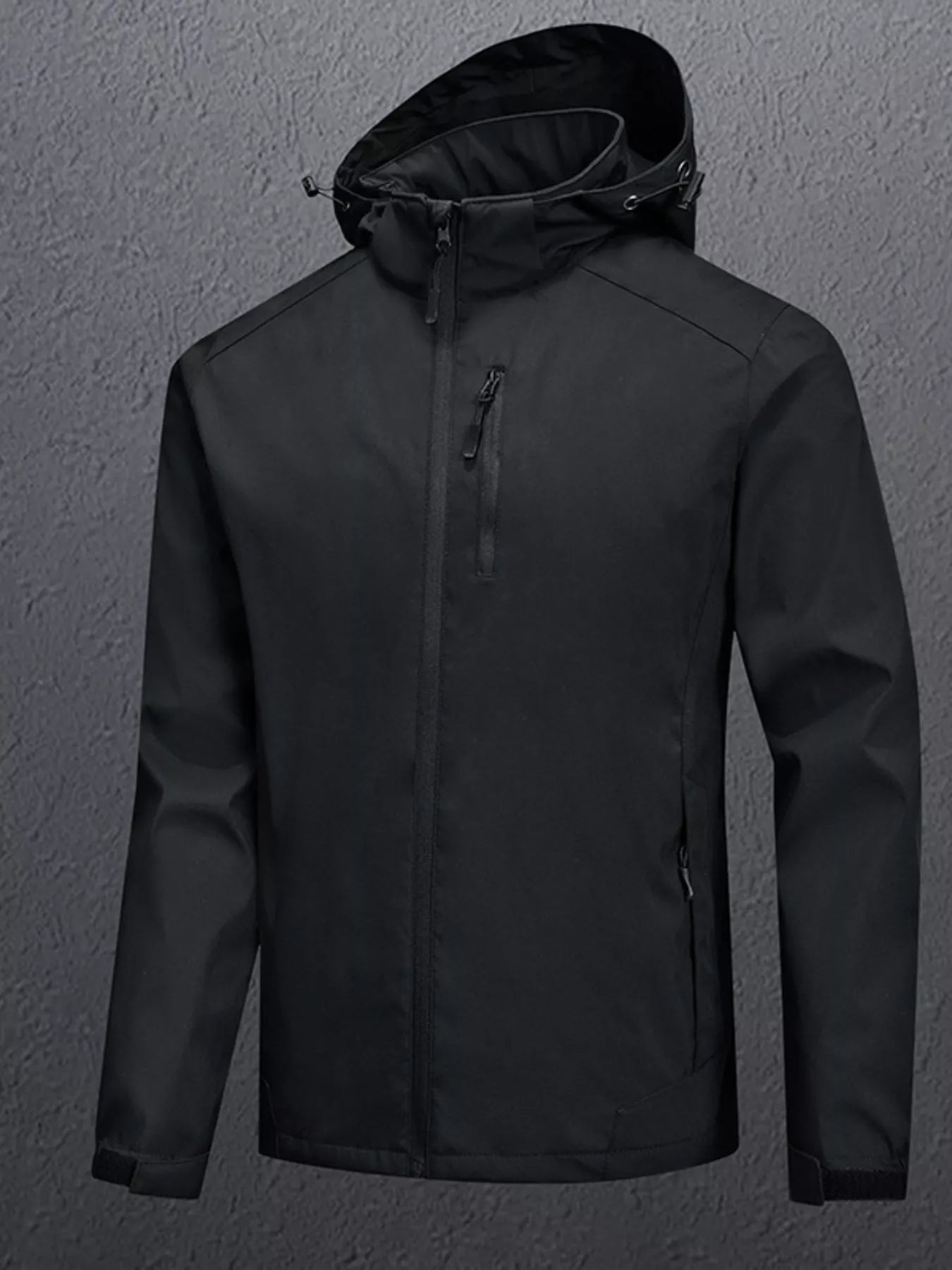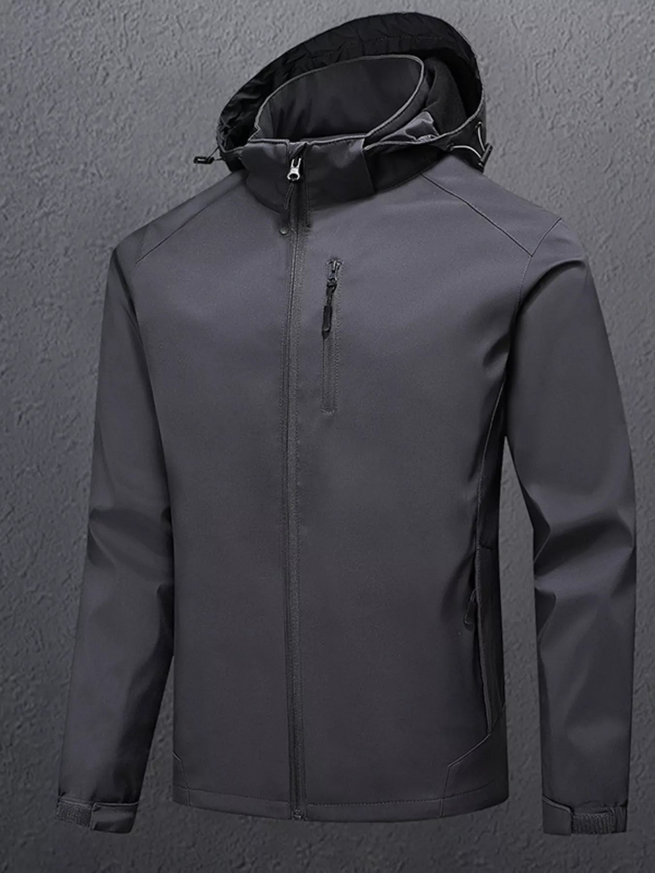 Casaco de homem plus size com fecho, mangas compridas e capuz.